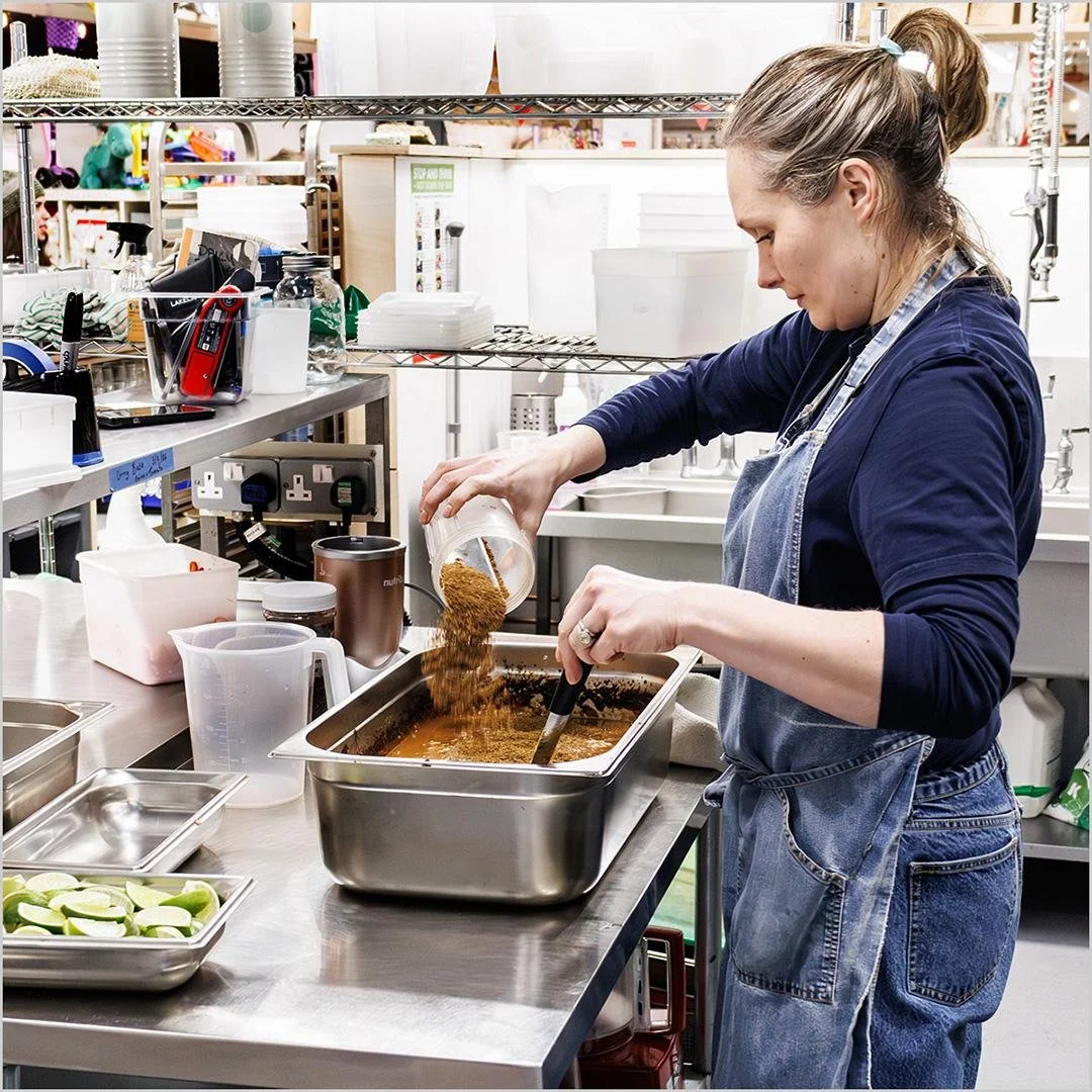 When planning dishes, the starting point is always the produce. We don’t order for the dishes we want to create; we create dishes from the produce we have available. In many ways, it is the quintessential home-cook approach, opening the fridge door and asking, what can I make from this? With the added challenge of scaling that up to 100 portions per meal and finding our place in a vibrant town centre location with multiple other restaurant options.